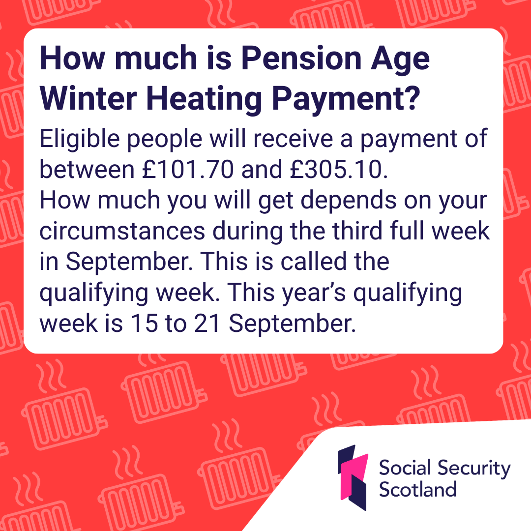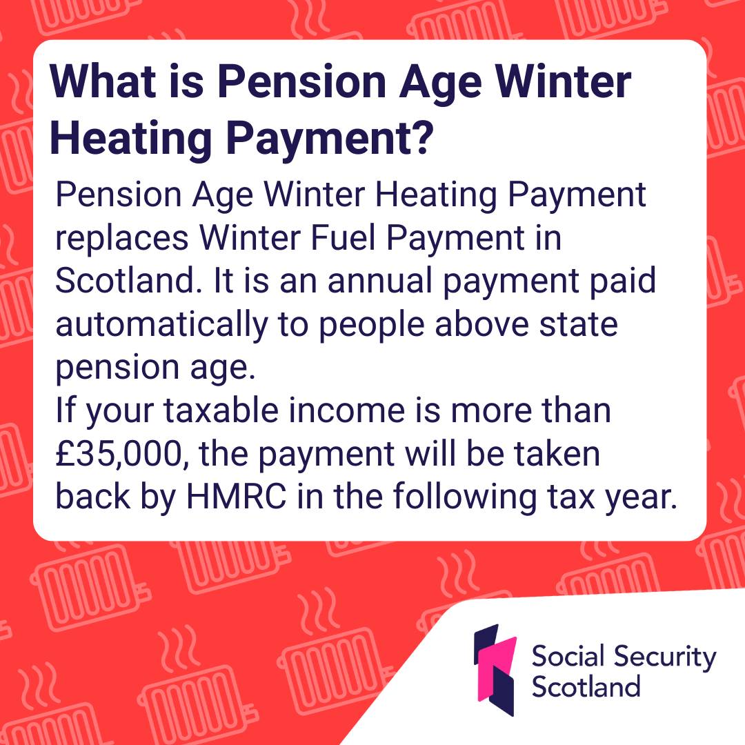Pension Age Winter Heating Payment replaces Winter Fuel Payment in Scotland. It is an annual payment paid automatically to people above state pension age.